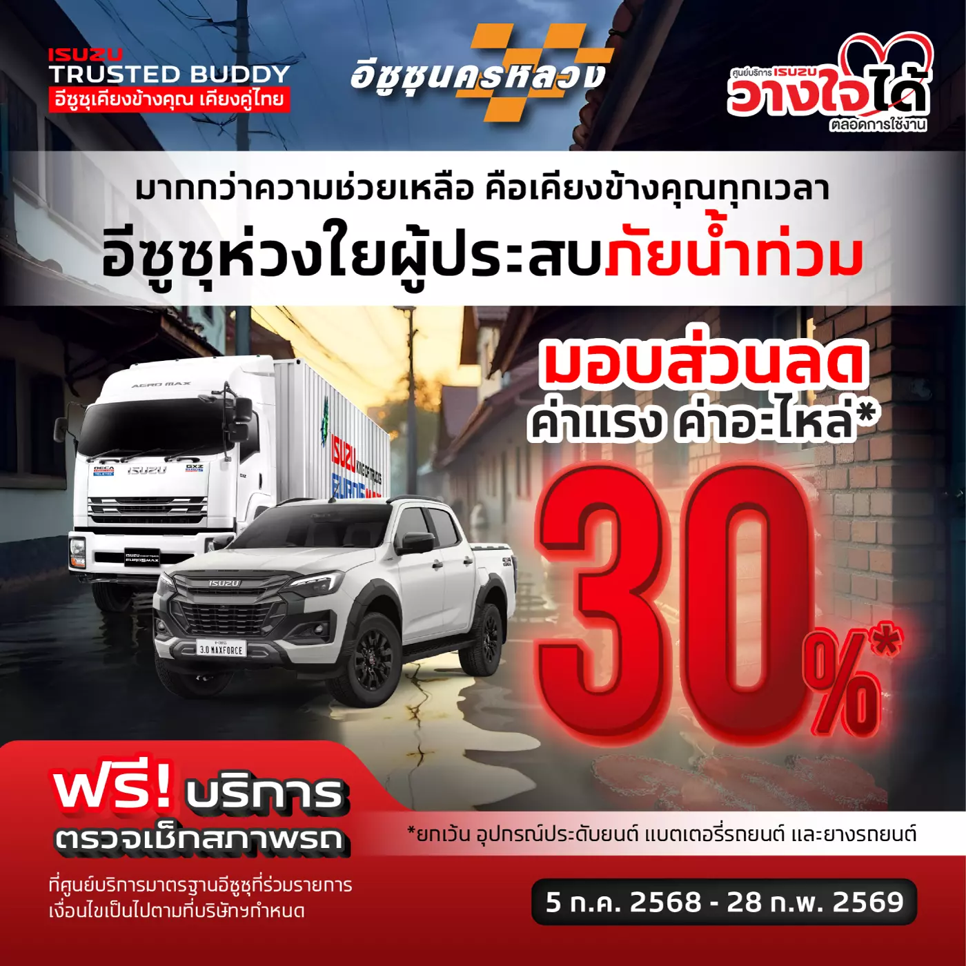 อีซูซุห่วงใยผู้ประสบภัยน้ำท่วม ตรวจเช็กฟรี + ลดค่าแรง–อะไหล่ 30% พร้อมคำแนะนำตรวจเช็กรถลุยน้ำอย่างถูกวิธี